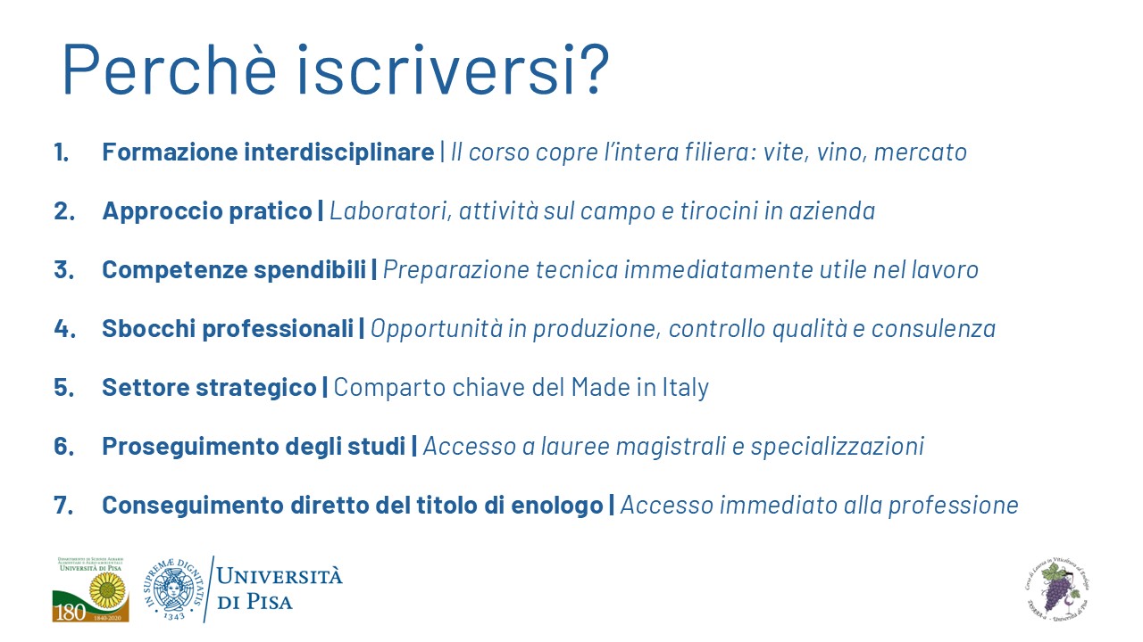 Il corso di laurea in Viticoltura ed Enologia (L-26) forma professionisti pronti a operare nel mondo del vino e dell’agroalimentare, unendo scienza, tecnologia e passione per il territorio. Il percorso offre una preparazione interdisciplinare che spazia dalla coltivazione della vite alla produzione del vino, dal controllo di qualità al marketing, con attenzione alla sostenibilità e alle moderne strategie produttive.