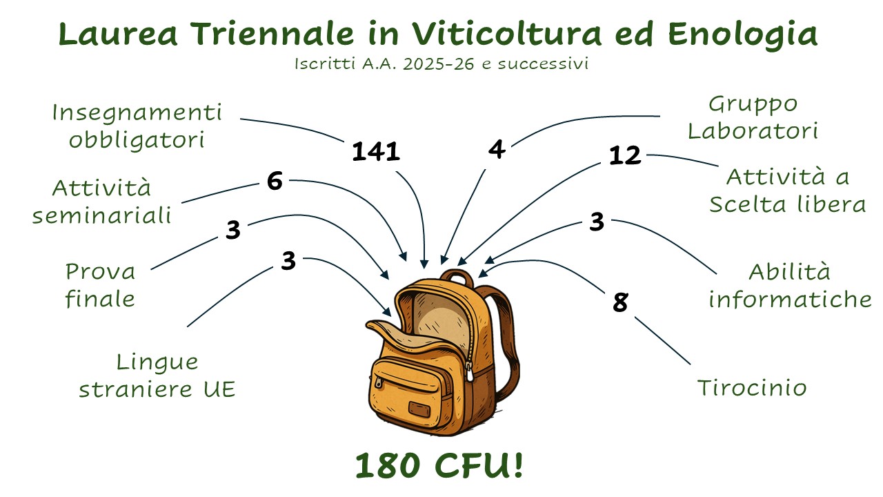 - Da lunedì 27 ottobre 2025 a venerdì 31 ottobre 2025 e da martedì 7 aprile 2026 a venerdì 10 aprile 2026 sono i periodi di sospensione delle lezioni per prove in itinere o attività di tutorato/supporto didattico per il 1 e 2 anno del corso di laurea in Scienze agrarie e del 1 anno del corso di laurea in Viticoltura ed enologia;